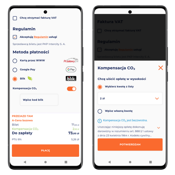 Kompensacja CO₂ dostępna jest przy zakupie biletu w naszych własnych systemach online – na stronie internetowej i w aplikacji mobilnej PKP Intercity – przy wyborze płatności Kartą, Google Pay, Apple Pay lub Blikiem.