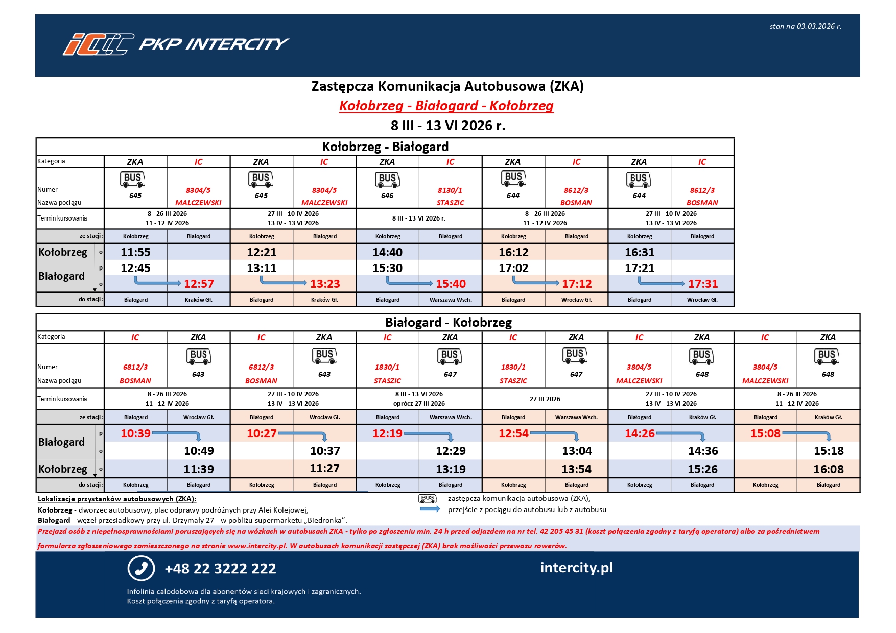 Na trasie Kołobrzeg - Białogard w okresie od 8 marca do 13 czerwca 2026 roku obowiązywać będzie Zastępcza Komunikacja Autobusowa.