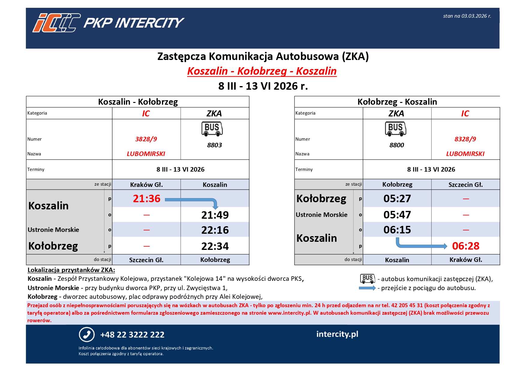 - Kołobrzeg – dworzec autobusowy, plac odprawy podróżnych przy Alei Kolejowej – sprawdź lokalizację na mapieotwiera się w nowym oknie