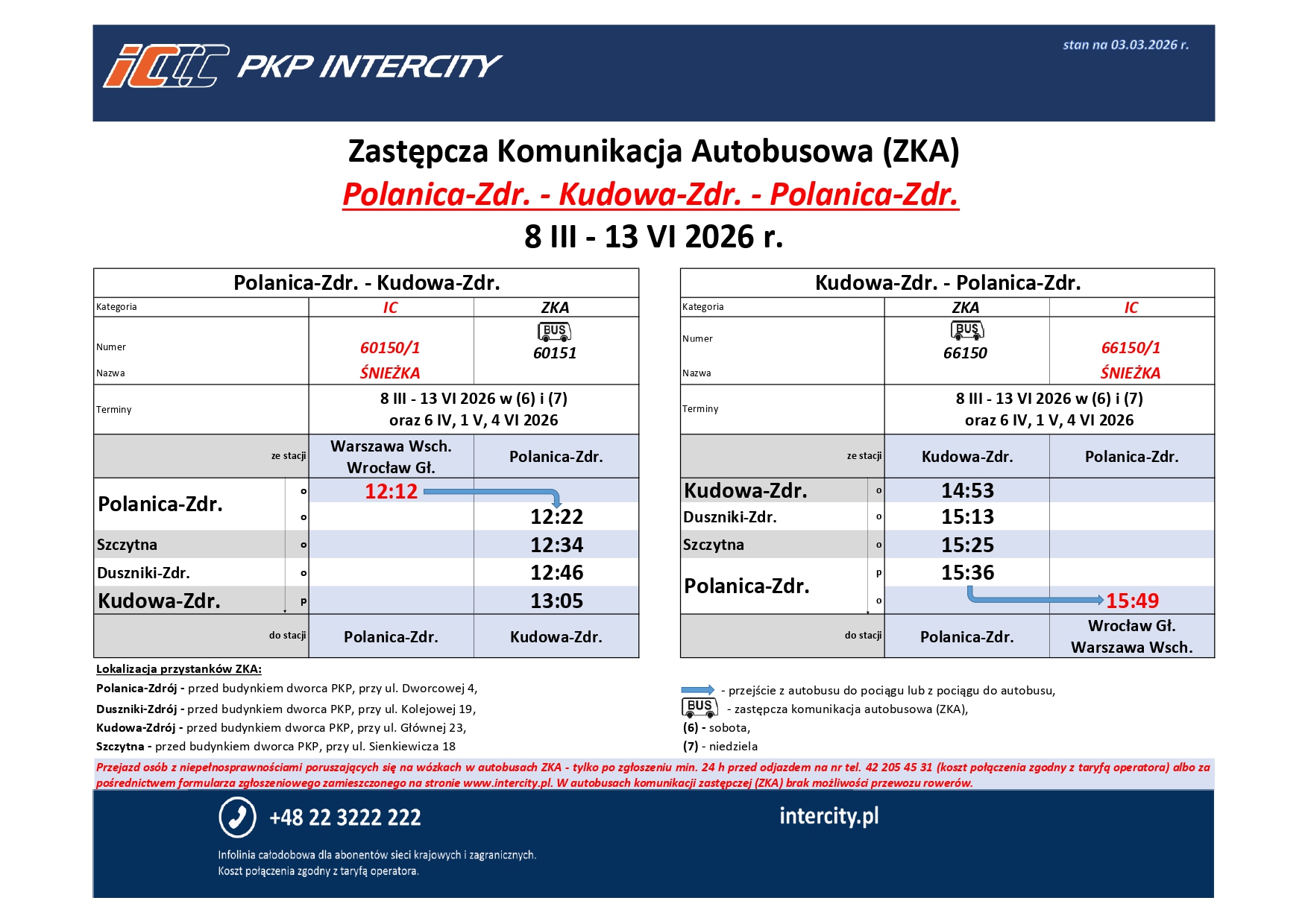 Na trasie Polanica-Zdrój - Kudowa-Zdrój w okresie od 8 marca do 13 czerwca 2026 roku obowiązywać będzie Zastępcza Komunikacja Autobusowa.