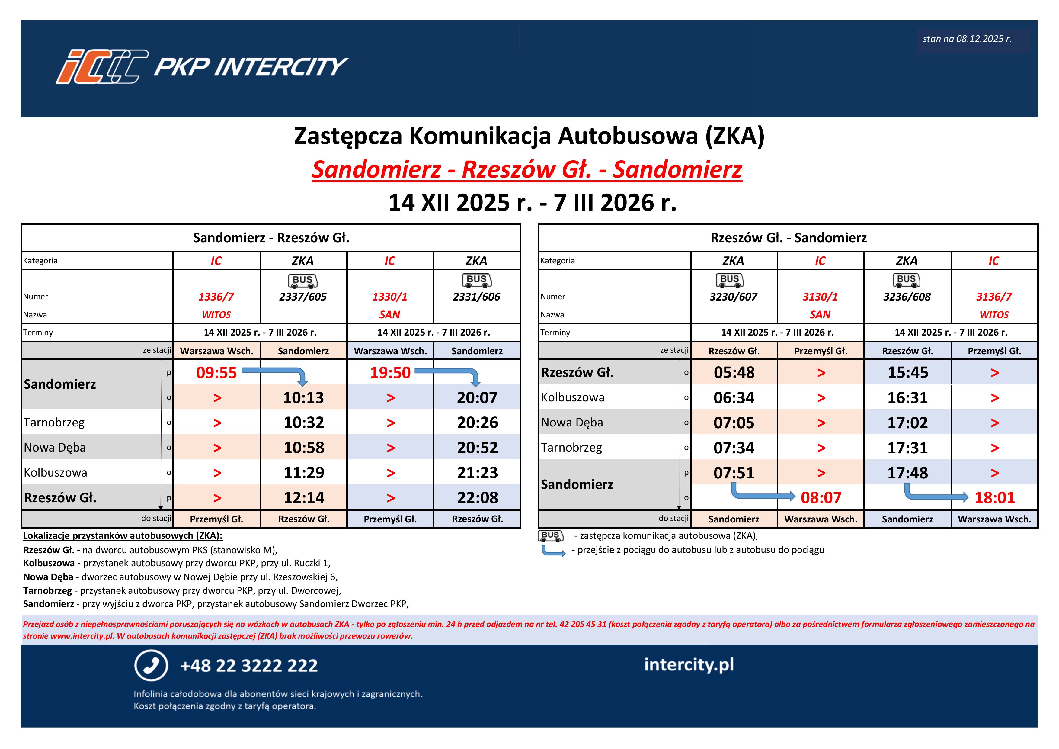 Na trasie Sandomierz - Rzeszów Główny w okresie od 14 grudnia 2025 roku do 7 marca 2026 roku obowiązywać będzie Zastępcza Komunikacja Autobusowa.