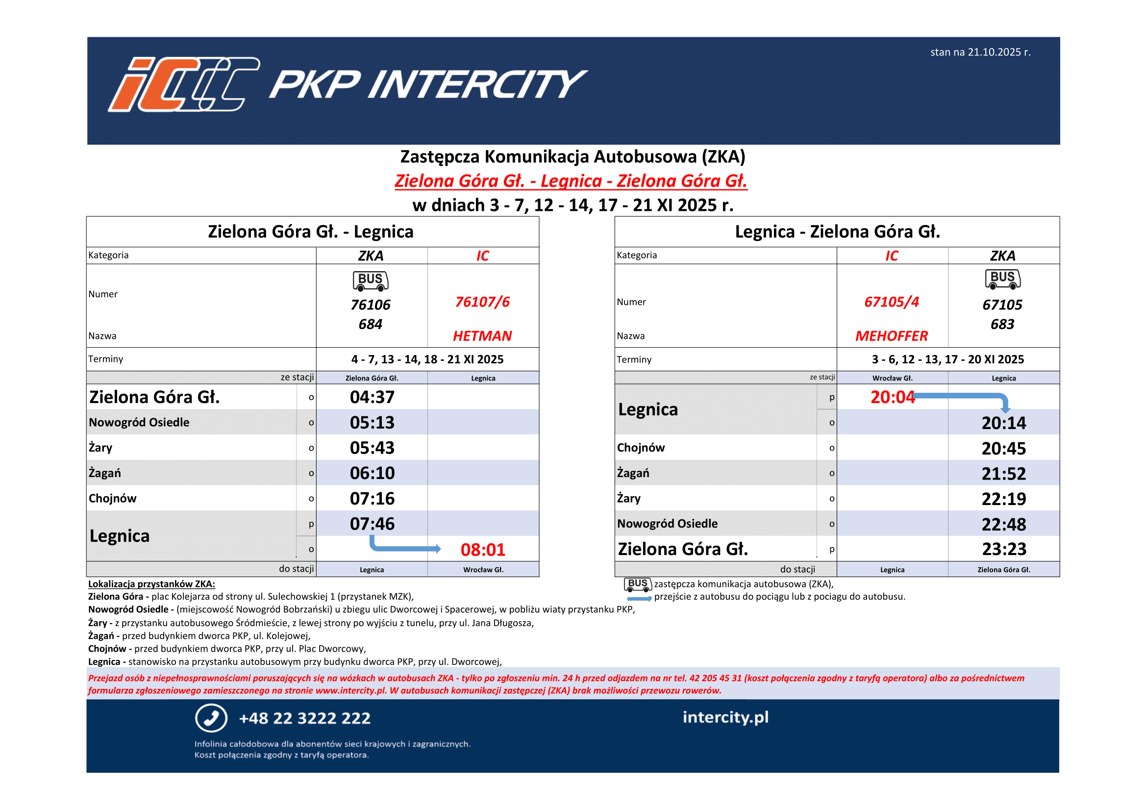 - Legnica – stanowisko na przystanku autobusowym przy budynku dworca PKP, przy ul. Dworcowej – sprawdź lokalizację na mapieotwiera się w nowym oknie