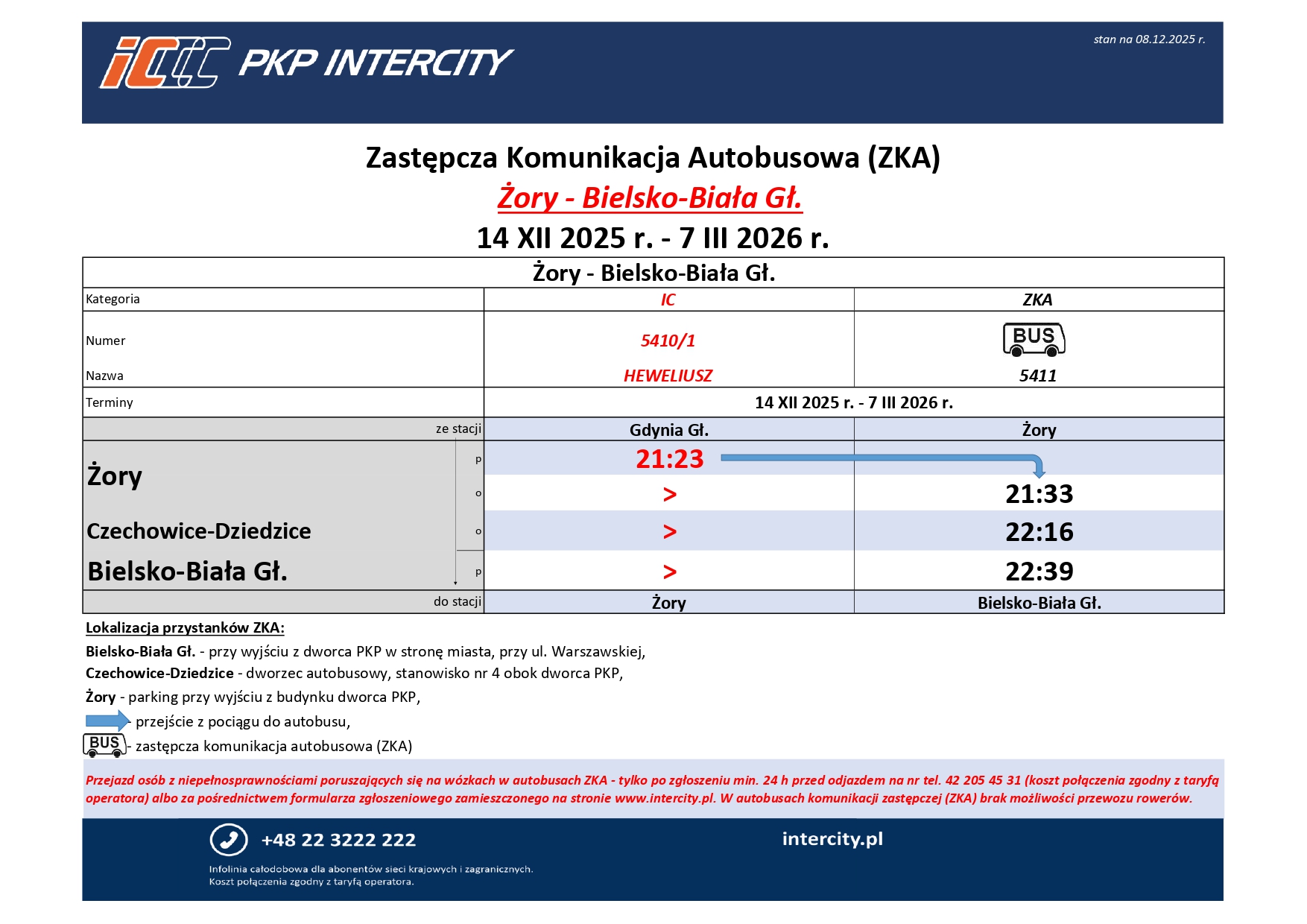 - Czechowice-Dziedzice – dworzec autobusowy, stanowisko nr 4 obok dworca PKP – sprawdź lokalizację na mapieotwiera się w nowym oknie
